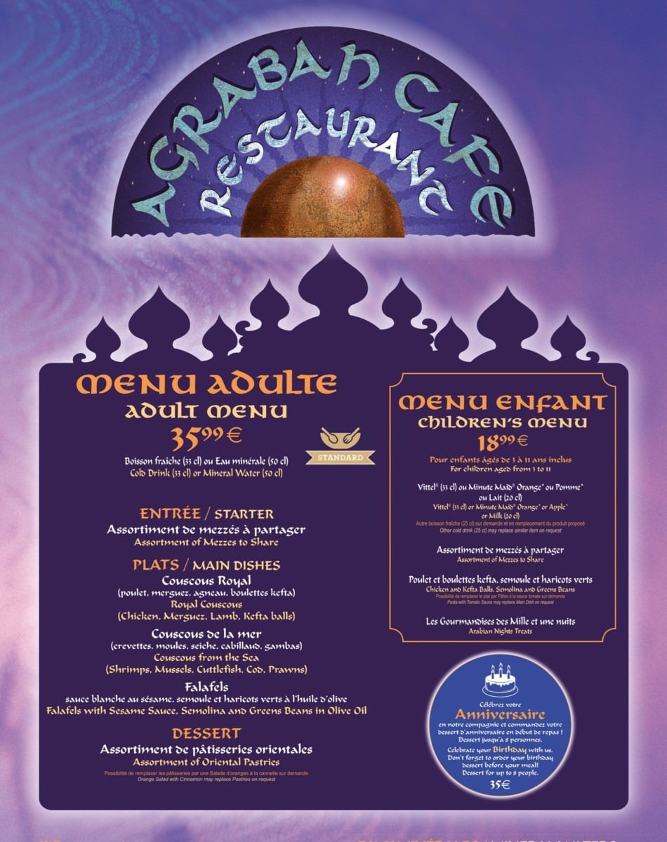 The Agrabah Cafe menu was also « updated » or rather « simplified » with only 1 choice instead of 3 for appetizers and desserts which are now « sharing platters ». Nickel and diming even in Agrabah.