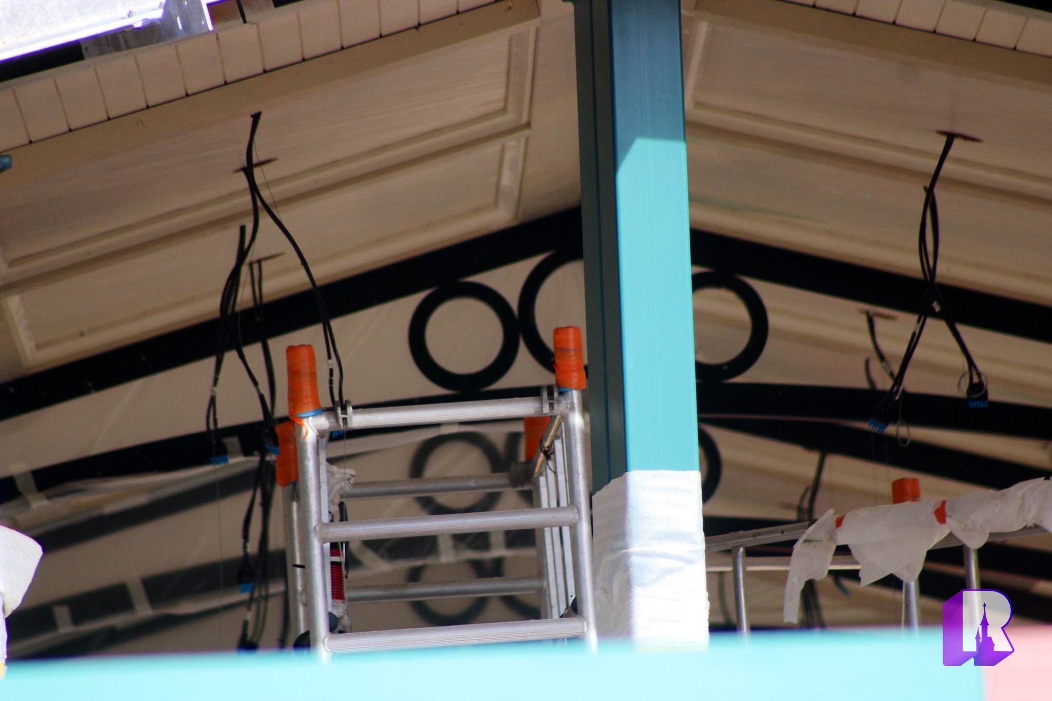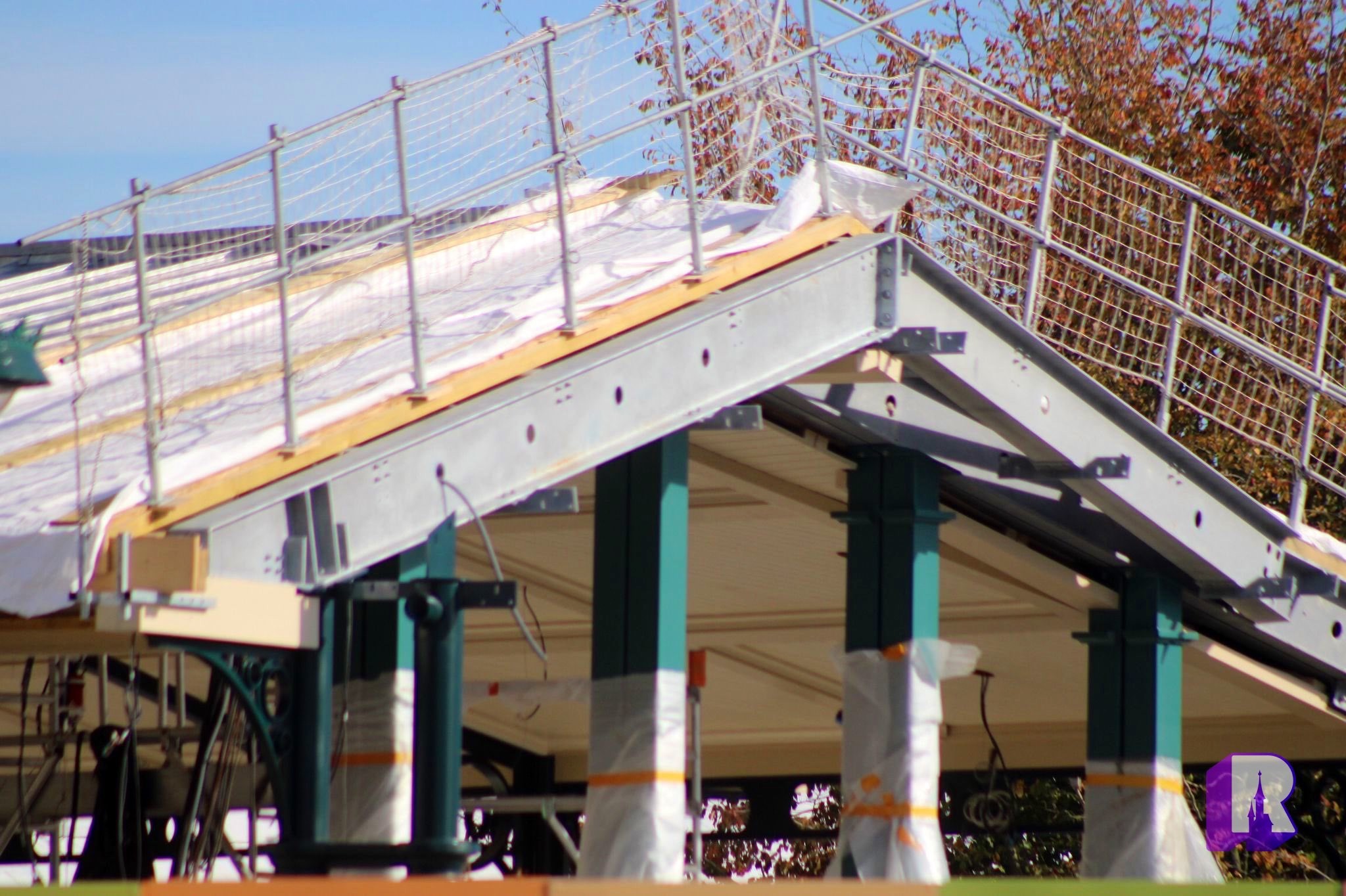 Over in the Resort Hub, the new security gates are coming along nicely. This first piece of the new gate area is already receiving wood theming and lighting under the roofs as well as theming on the sides.