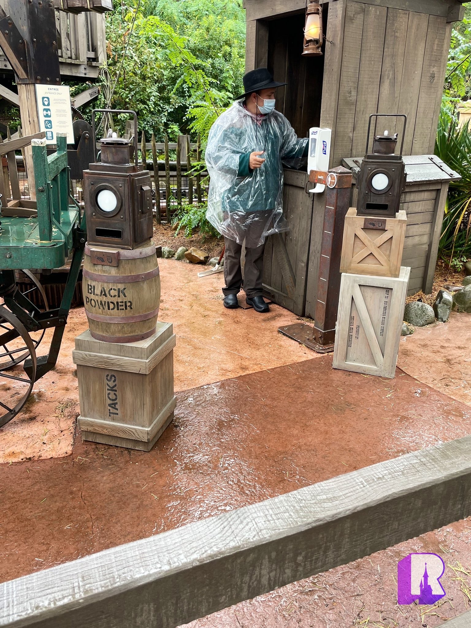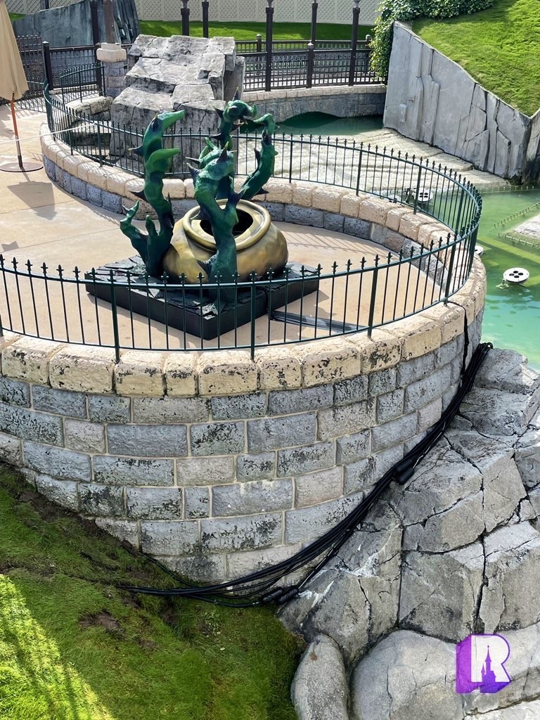 In front of Sleeping Beauty Castle, the “brambles trees” were placed on the grass which makes no sense at all given the affect is meant to look like they’re coming out the the pavement. There’s also a cauldron with quite a bit of tech behind it – so possibly a character moment here.