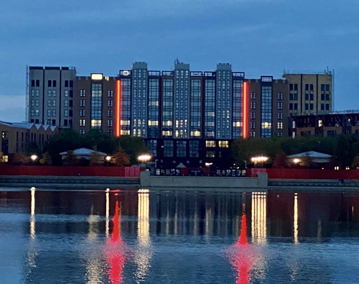 And at Disney’s Hotel New York – The Art of Marvel, testing on additional red strips is ongoing. There will ultimately be 4 strips on the front and 4 on the back facade. The reflection on the Lake is pretty cool: