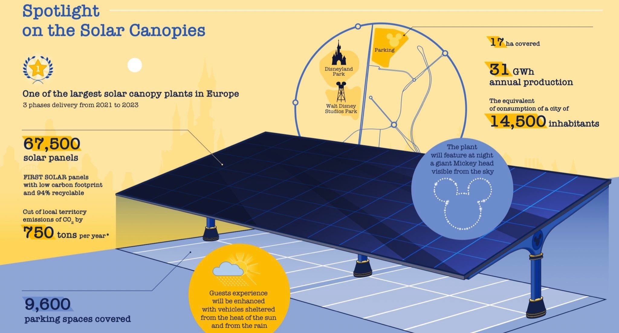 The canopies will protect the cars from the heat and rain all while producing energy (which won’t be exclusively used by Disneyland Paris). When complete in 2023, it will reduce local territory emissions of CO2 by 750 tons per year. The first completion milestone for installation will be phase 1 in Spring 2021. Here are more facts about the project: