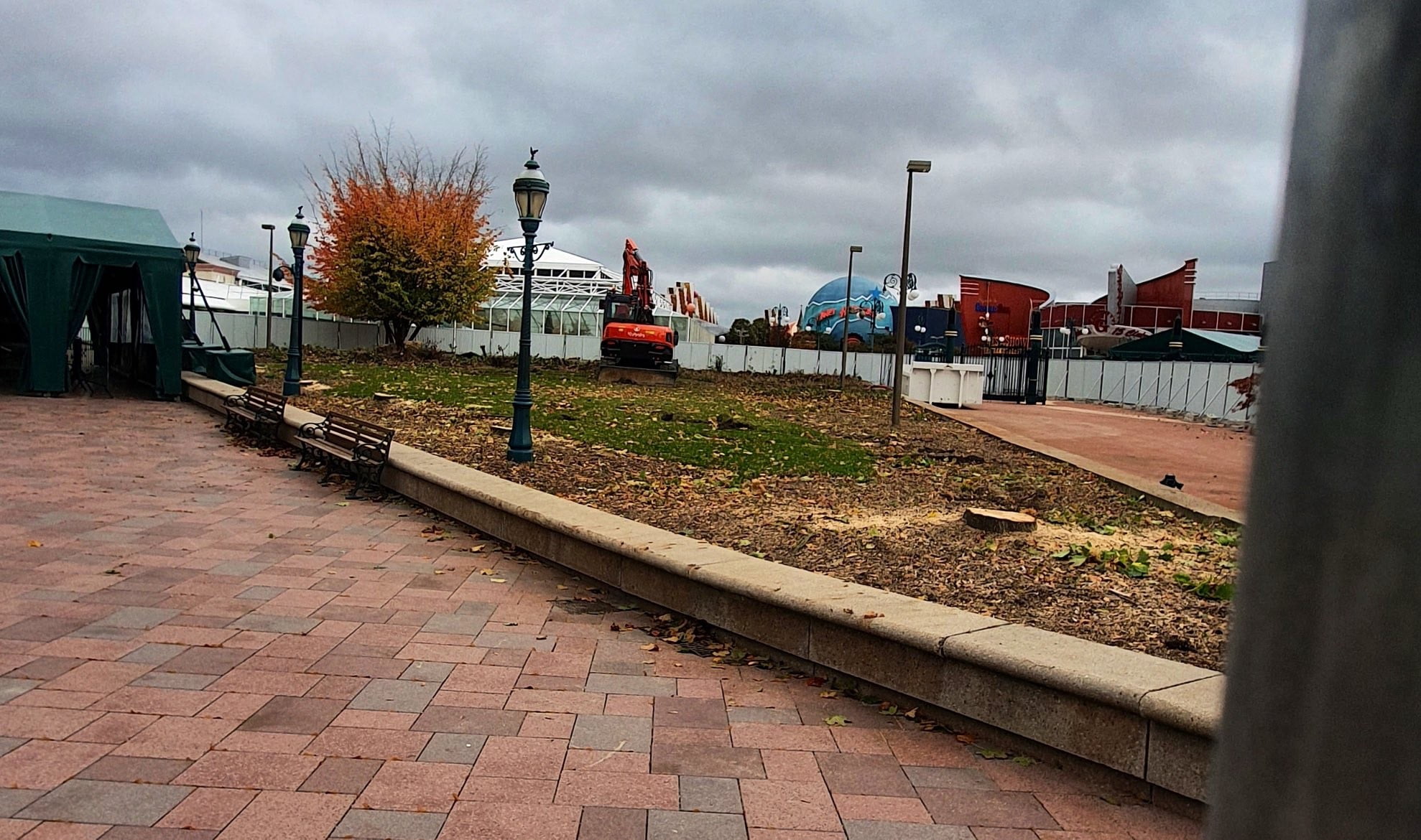 In the Fantasia Gardens, walls went up on the next phase of the entrance and security screening remodel. All the trees were sadly quickly cut off: