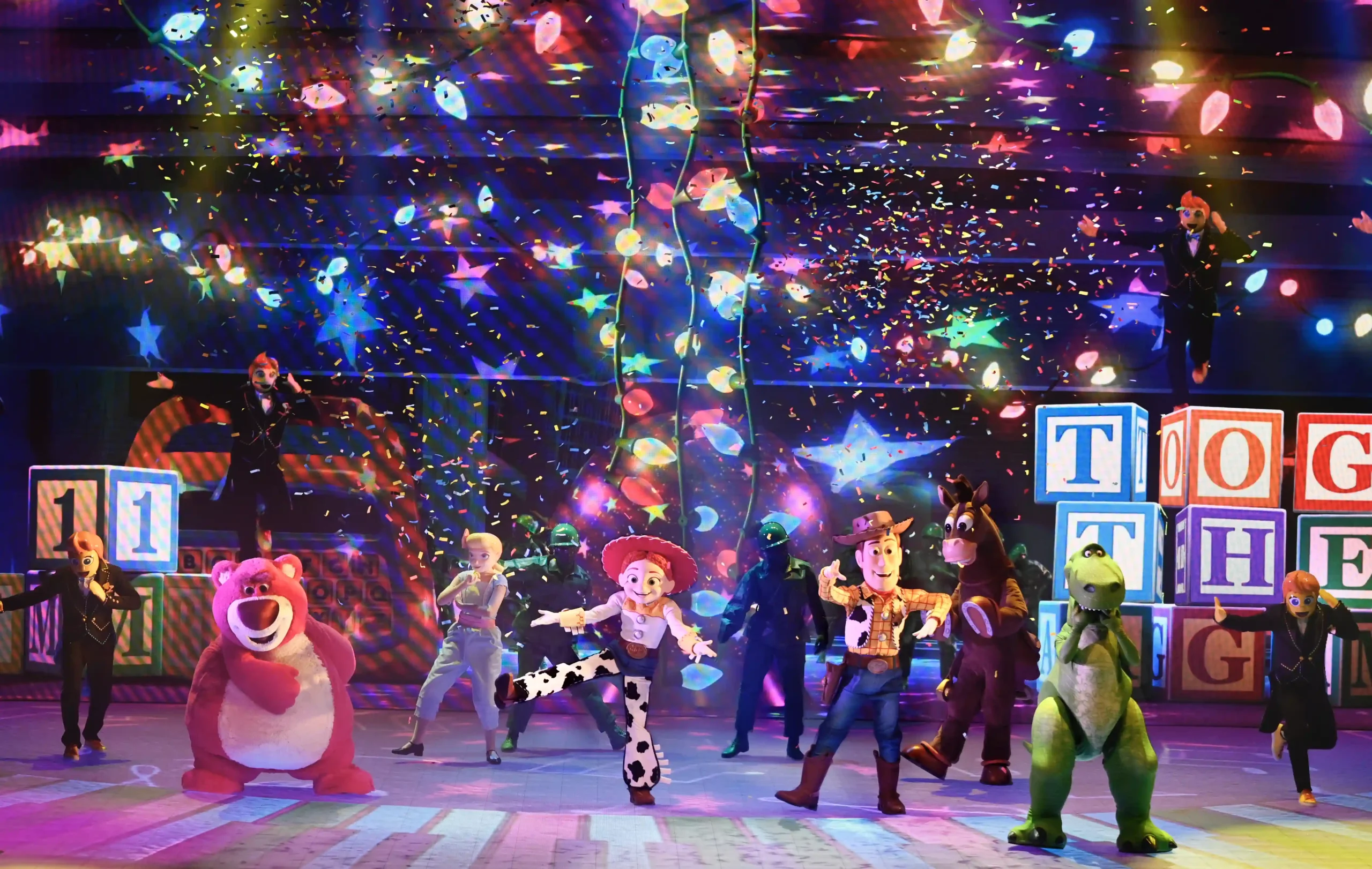 The photos show different scenes of « Together: A Pixar Musical Adventure » premiering on July 15, 2023, at Walt Disney Studios Park.